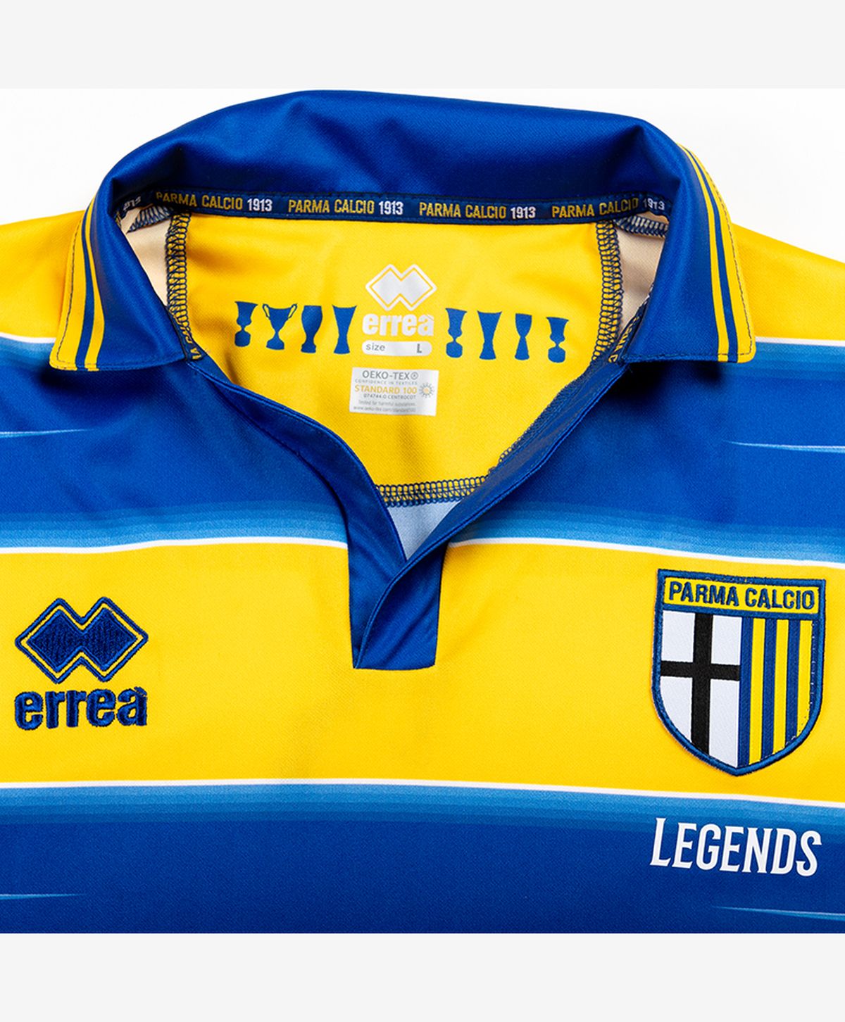 Infine, il colletto è blu con finiture gialle, così come gialli sono anche i bordi delle maniche, mentre l’unico elemento nuovo sono i trofei aggiunti all’interno del colletto. Il logo di Erreà sul petto a destra è blu scuro, mentre quello del Parma si trova a sinistra con la scritta “LEGENDS”.