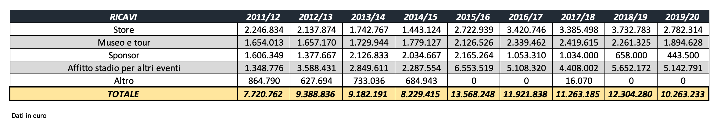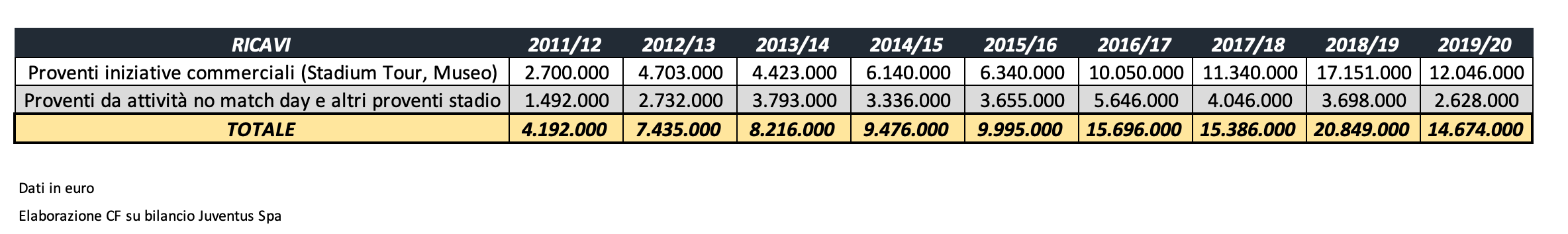 Calo ancora maggiore invece per i ricavi dello Juventus Stadium nella stagione 2019/20, la terza in cui ha avuto la nuova denominazione di Allianz Stadium.