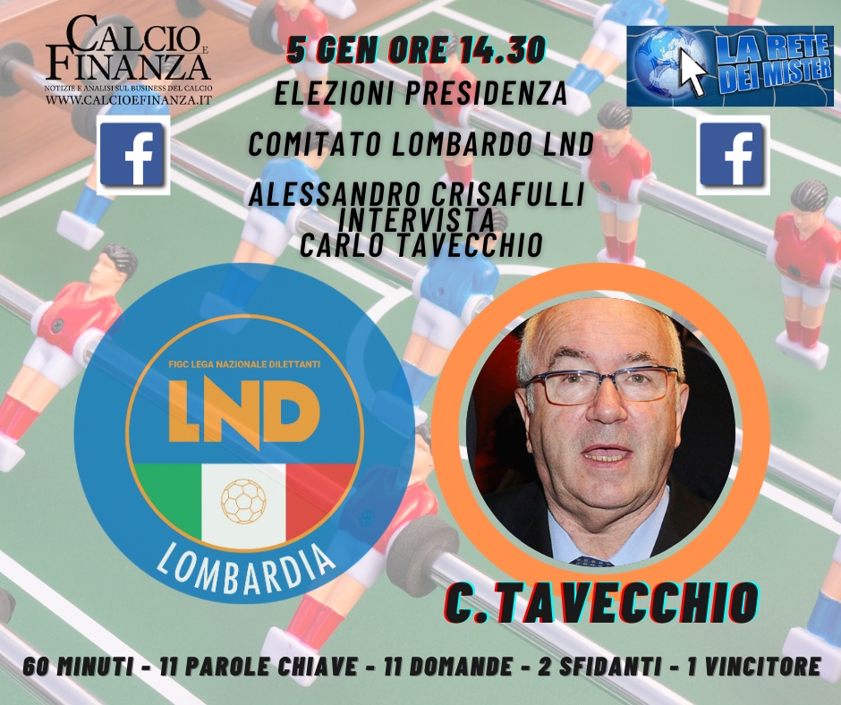 Verso le elezioni, Calcio e Finanza ha organizzato due videointerviste esclusive con i candidati, Carlo Tavecchio e Alberto Pasquali. Per conoscere progetti, proposte, prospettive: per la ripartenza, per i campionati, per il presente e il futuro del calcio lombardo. Ma anche impegni e aiuti concreti per i Club e gli operatori del settore.