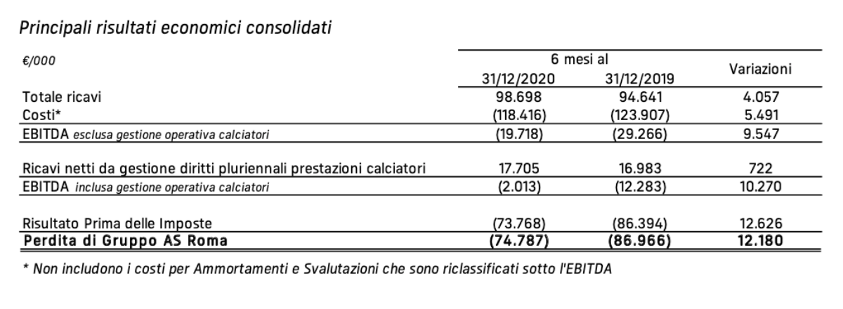 Nei primi sei mesi del corrente esercizio il club di proprietà della famiglia Friedkin ha visto i ricavi, al netto della gestione del parco calciatori, aumentare a 98,69 milioni di euro (94,64 milioni nel primo semestre 2019-2020), mentre i costi di gestione si sono ridotti a 19,71 milioni (29,26 milioni).
