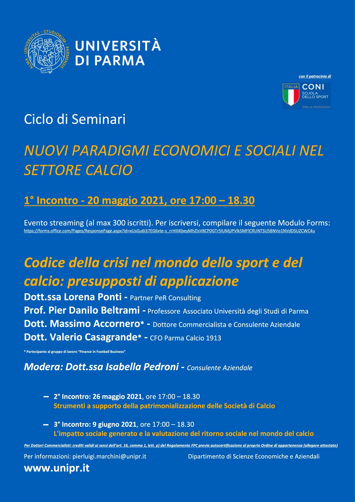 Prende il via giovedì 20 maggio alle 17 il ciclo di seminari Nuovi paradigmi economici e sociali nel settore calcio, tre incontri organizzati dal Dipartimento di Scienze Economiche e Aziendali dell’Università di Parma col patrocinio del CONI.