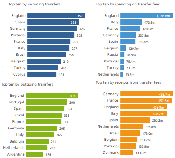 A proposito della spesa sostenuta per i trasferimenti, l’Inghilterra rimane salda in testa e stacca tutte le altre associazioni con oltre 1,14 miliardi di dollari spesi per l’acquisto di calciatori. Segue l’Italia, ancora una volta seconda, con 473,8 milioni di dollari (400 milioni di euro). Il podio è completato dalla Francia con 428,9 milioni di dollari.