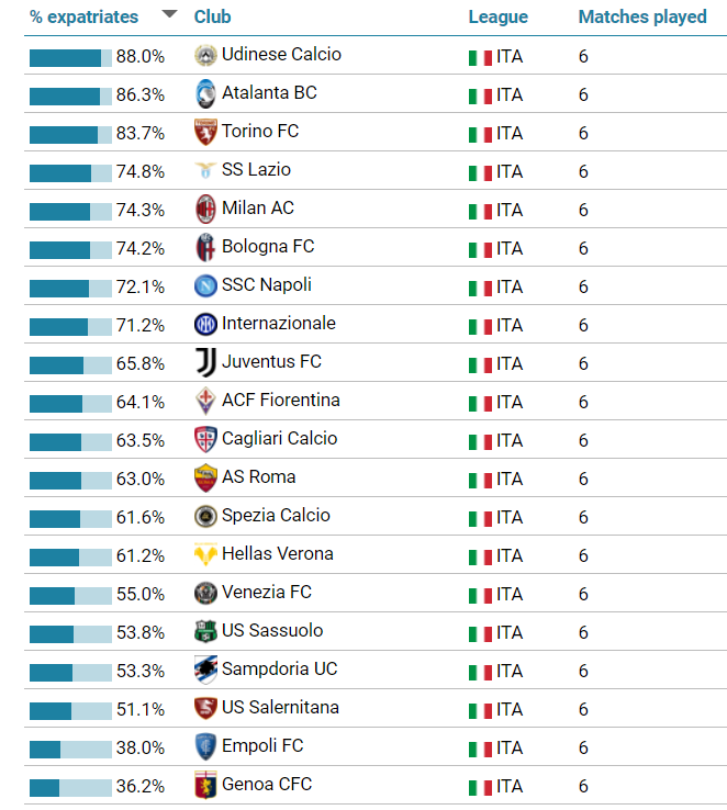 Il valore complessivo più alto – per quanto riguarda Premier League, Liga, Serie A, Bundesliga e Ligue 1 – è stato fatto registrare da una formazione italiana: l’Udinese. Con l’88% dei minuti totali giocato da calciatori stranieri, i friulani si trovano al primo posto in graduatoria.