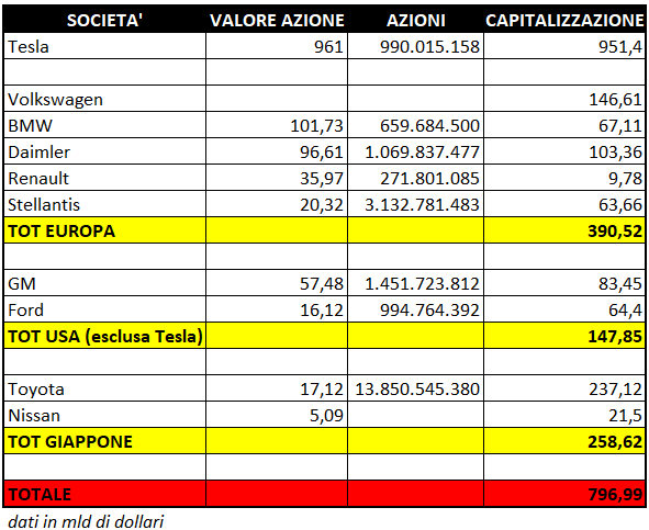 In Europa, invece, tenendo conto di tutte le cinque case automobilistiche europee individuate – e comprendendo la franco-italo-statunitense Stellantis – il valore è stimato in 390 miliardi di dollari sulla base della capitalizzazione di mercato, oltre due volte in meno rispetto a Tesla.