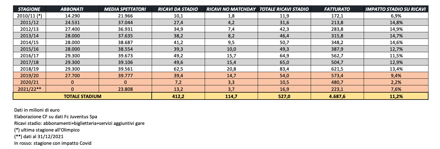 Dall’apertura fino al 31 dicembre 2021, lo stadio ha garantito alla Juventus circa l’11% dei ricavi complessivi (plusvalenze comprese): si va dal massimo del 14,9% del 2012/13 ad un minimo del 2,8% nel primo semestre 2020/21 (in cui tutte le gare si sono disputate a porte chiuse, fatta eccezione per poche partite con 1000 spettatori) con una percentuale stabile prima del Covid intorno al 13%. Una crescita rilevante rispetto all’era Olimpico: basti pensare che nel primo semestre 2021/22 i ricavi dalla sola biglietteria sono stati comunque pari a 13,2milioni, contro i 10 milioni dell’ultima annata pre-Stadium.