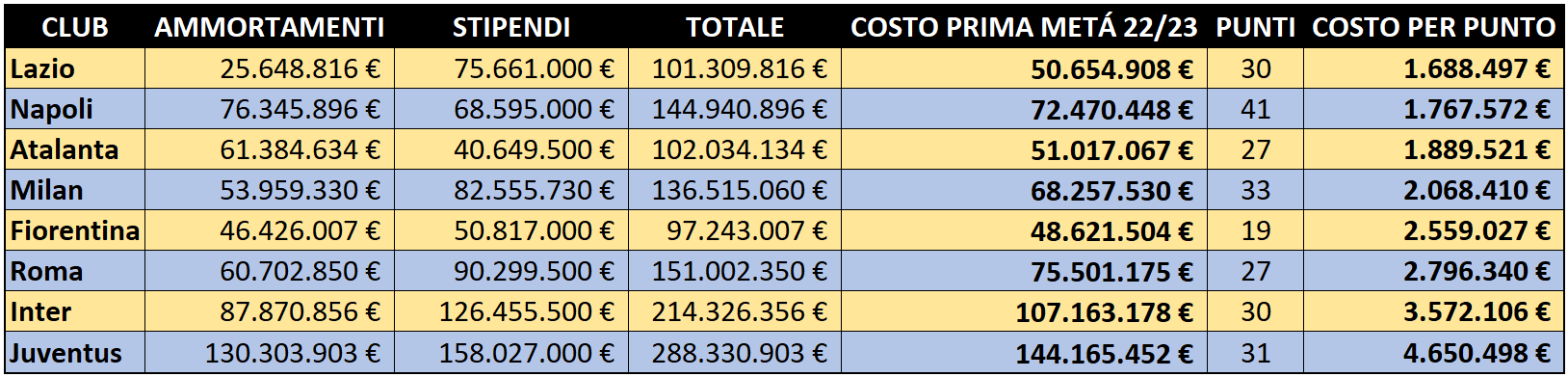 Quanto costa un punto in Serie A? Conclusi i primi sei mesi di stagione – anche se in Serie A si sono giocate solamente 15 partite sulle 19 del girone di andata – è possibile fare un primo bilancio: chi ha speso meglio i propri soldi al giro di boa della stagione 2022/23? Per questo Calcio e Finanza ha realizzato un’elaborazione sul rapporto tra costo della rosa (monte ingaggi lordo più ammortamenti e costo di eventuali prestiti) e punti conquistati dalle otto big della Serie A, sette delle quali occupano le prime posizioni in campionato.