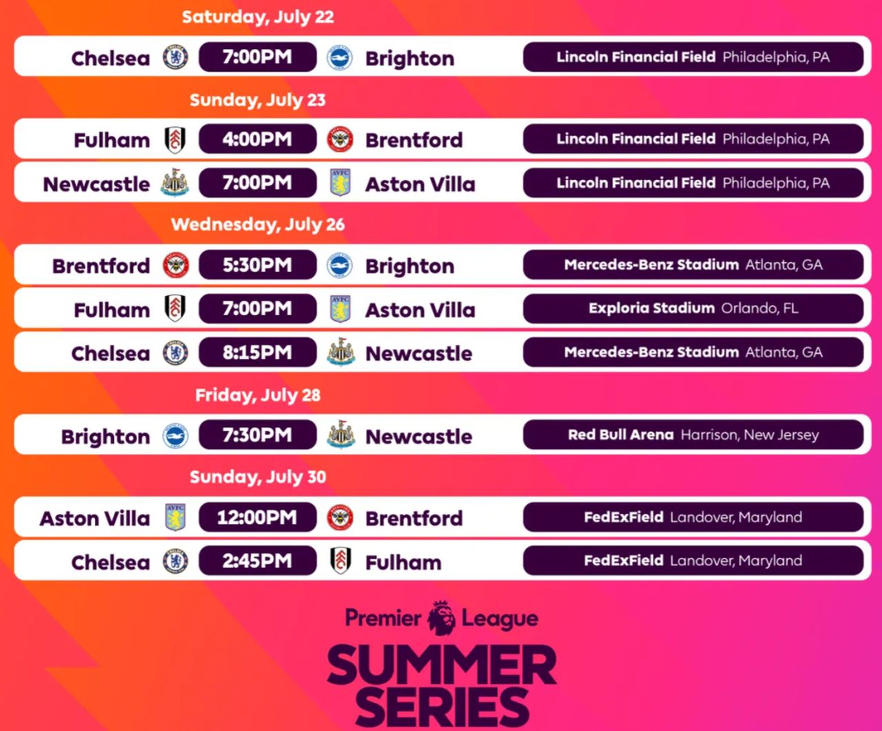 Le sei società coinvolte prenderanno parte a incontri amichevoli ed eventi in cinque grandi città della costa orientale. I club confermati per quelle che sono state ribattezzate “Premier League Summer Series” sono: Aston Villa, Brentford, Brighton & Hove Albion, Chelsea, Fulham e Newcastle United. Le sei squadre si sfideranno in un totale di nove partite tra sabato 22 luglio e domenica 30 luglio negli stadi di Atlanta (Georgia), Harrison (New Jersey), Orlando (Florida), Philadelphia (Pennsylvania) e Landover (Maryland).