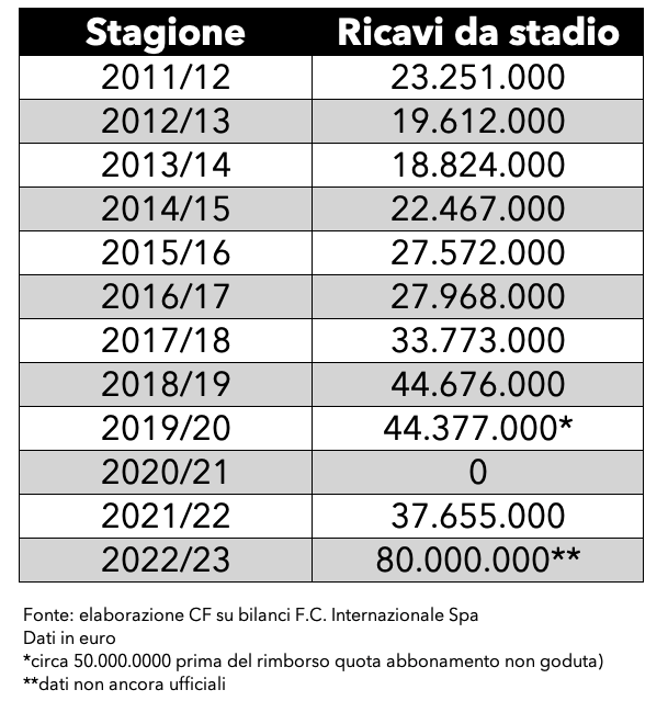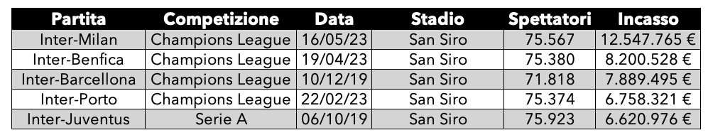 Ricavi spinti dagli incassi al botteghino, tanto che tre delle prime cinque sfide per incassi della storia interista sono andate in scena in questa stagione, ovverosia il derby di ieri, Inter-Benfica e Inter-Porto. In generale, si tratterà inoltre di una stagione record anche per quanto riguarda le presenze, con una media spettatori che per la prima volta supererà i 70mila spettatori lungo il corso di tutta una annata.