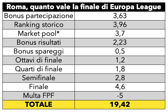 Nel complesso, considerando anche la multa da 5 milioni da scontare nei ricavi UEFA per le violazioni del Financial Play Finanziario, la Roma ha incassato dal suo cammino in Europa League finora premi la cifra di 14,82 milioni di euro. In caso di qualificazione alla finale, il bonus sarebbe pari a ulteriore 4,6 milioni, con un incasso potenziale quindi pari a 19,42 milioni di euro se gli uomini di Mourinho superassero il Bayer Leverkusen in semifinale.