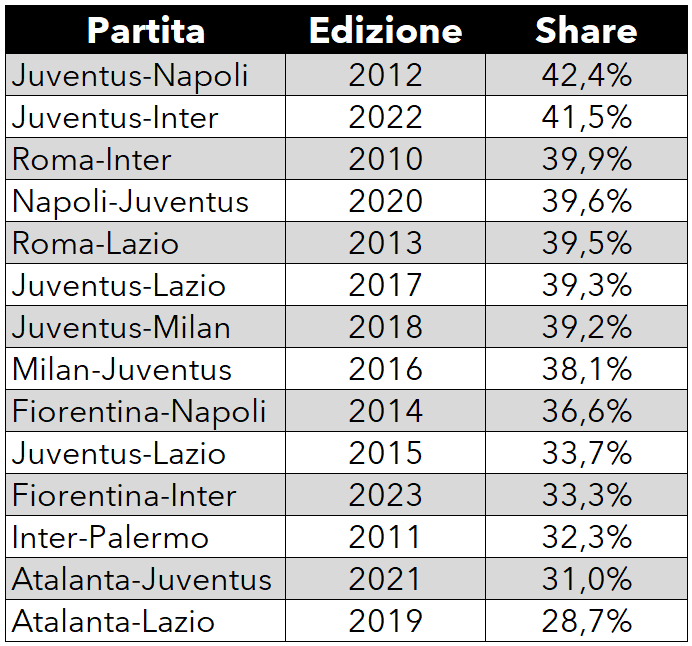 Leggermente diverso invece il discorso in termini di share: dal 2010 ad oggi, la finale di ieri è l’undicesima più vista come share, dietro alla gara del 2015 tra Juventus e Lazio. Un dato comunque inferiore rispetto alla maggior parte delle finali, ma proporzionalmente migliore in termini di share.