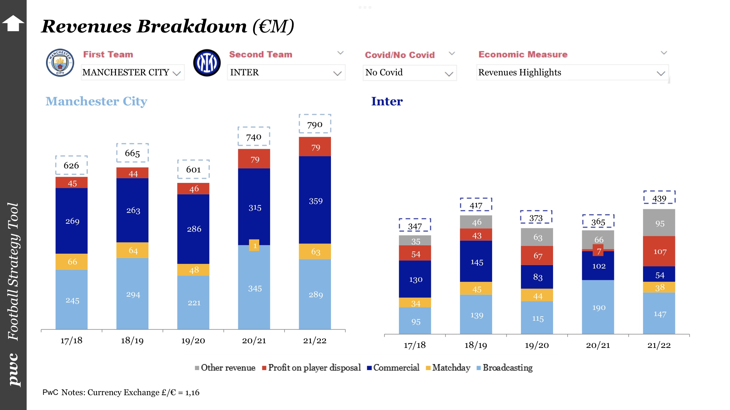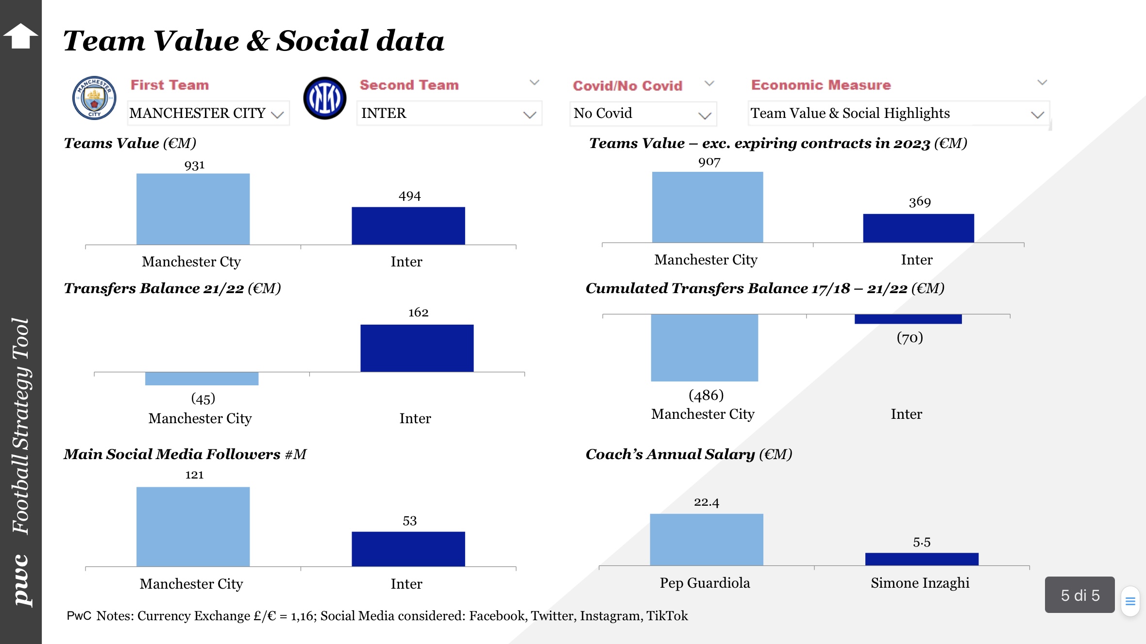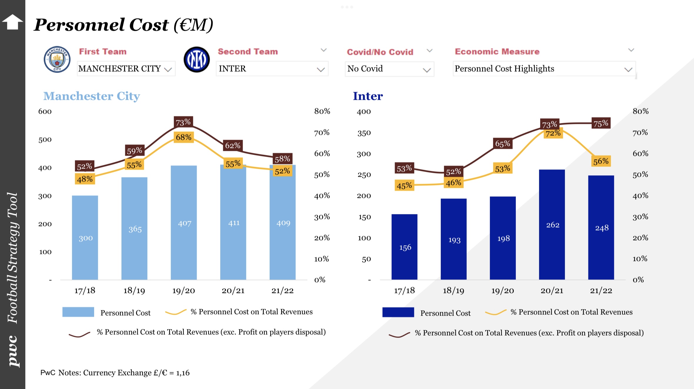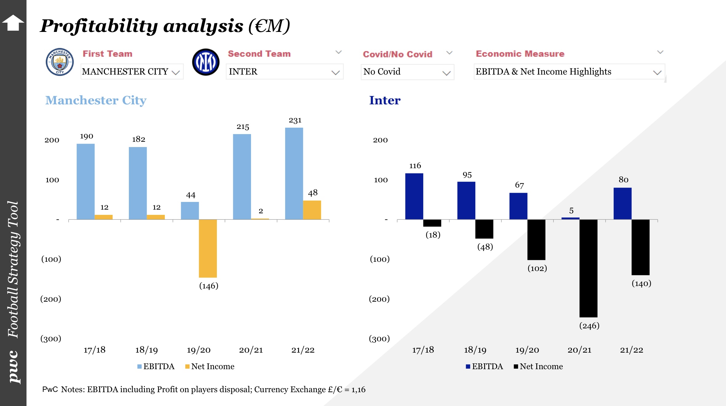 Abbiamo quindi voluto analizzare i conti dei due club, in un confronto realizzato utilizzando i dati del Football Strategy tool di PwC, lo strumento che la nota società di consulenza ha realizzato per aiutare il management delle società calcistiche a prendere decisioni strategiche misurando le performance finanziarie, sportive e di coinvolgimento dei tifosi.