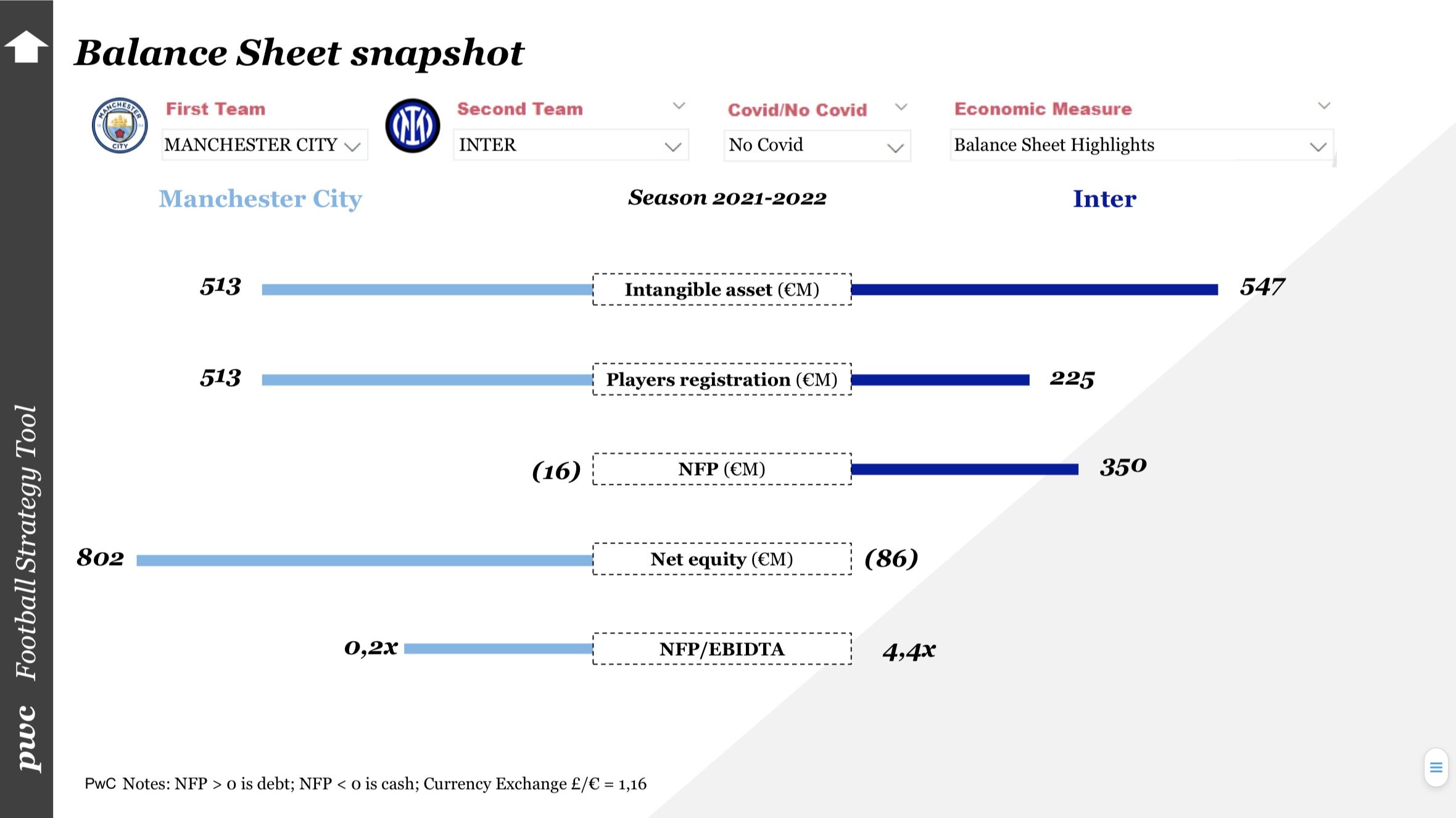 Per il club guidato da Suning, a livello patrimoniale è inoltre importante la differenza rispetto ai rivali sia per quanto riguarda la posizione finanziaria netta (-350 milioni rispetto al +16 del City) e per quanto riguarda il patrimonio netto, negativo per 86 milioni (situazione concessa dalle disposizioni del governo per gli anni della pandemia) rispetto agli 802 milioni in positivo dei citizens. Un divario che resta anche in altri kpi, come quello legato al rapporto PFN/EBITDA (-4.4 per i nerazzurri pari a 0,2 per gli inglesi).