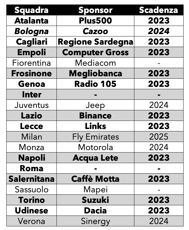 Di fatto, le uniche società ad avere contratti già firmati per la prossima stagione sono Milan (che ha da poco rinnovato con Fly Emirates), Monza (Motorola) e Verona (Sinergy) oltre a chi ha come logo sulla divisa un brand legato al proprietario come Fiorentina (Mediacom) e Sassuolo (Mapei) oltre alla stessa Juventus.