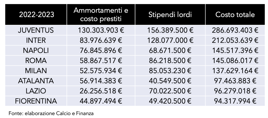 Nella stagione 2022-2023 la società di Serie A con la rosa più costosa è stata la Juventus, con un costo allargato della rosa di 286,7 milioni di euro, seguita dall’Inter (212,05 milioni) e dall’accoppiata Napoli–Roma, entrambi con un costo della rosa di circa 145 milioni di euro. Fuori dal podio dei club più costosi il Milan (137,6 milioni di euro), mentre Atalanta, Lazio e Fiorentina presentano un costo della rosa inferiore ai 100 milioni di euro.