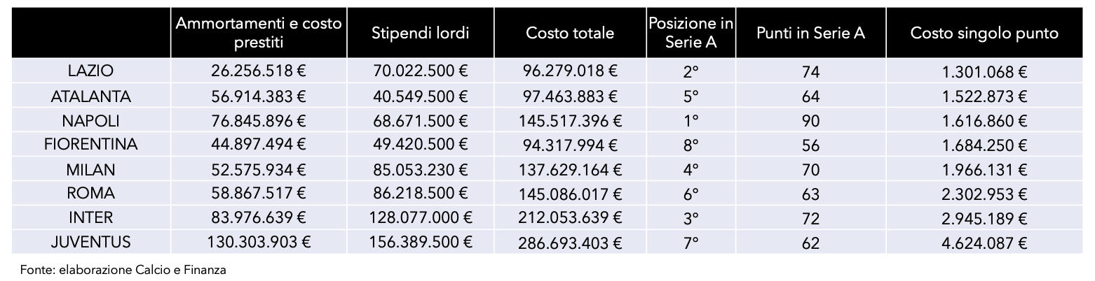 Incrociando i dati sul costo allargato delle rose dei club con i punti conquistati nell’ultima Serie A è possibile calcolare quanto è costato un singolo punto a fronte del costo sostenuto per la rosa nella stagione sportiva.