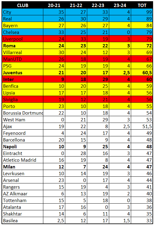 La Roma è invece la prima italiana in graduatoria, forte delle performance europee nelle ultime stagioni. Stesso discorso per il Villarreal, mentre per il Manchester United vale lo stesso discorso del Liverpool. Il PSG è dentro – unica francese –, mentre la seconda italiana al momento sarebbe la Juventus. Considerando già i primi punti per la stagione 2023/24, i bianconeri sentono il fiato sul collo da parte dell’Inter.