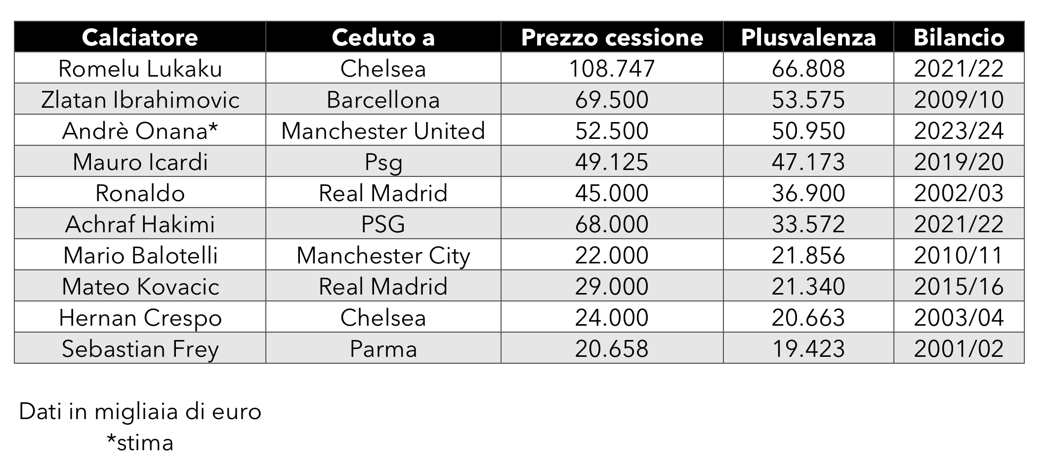 Per quanto riguarda le sole plusvalenze, quella maggiore è legata sempre all’affare Lukaku-Chelsea (quasi 67 milioni di euro). Sul podio anche Zlatan Ibrahimovic, con oltre 53 milioni di euro, mentre il terzo posto è occupato appunto da Onana (quasi 51 milioni).