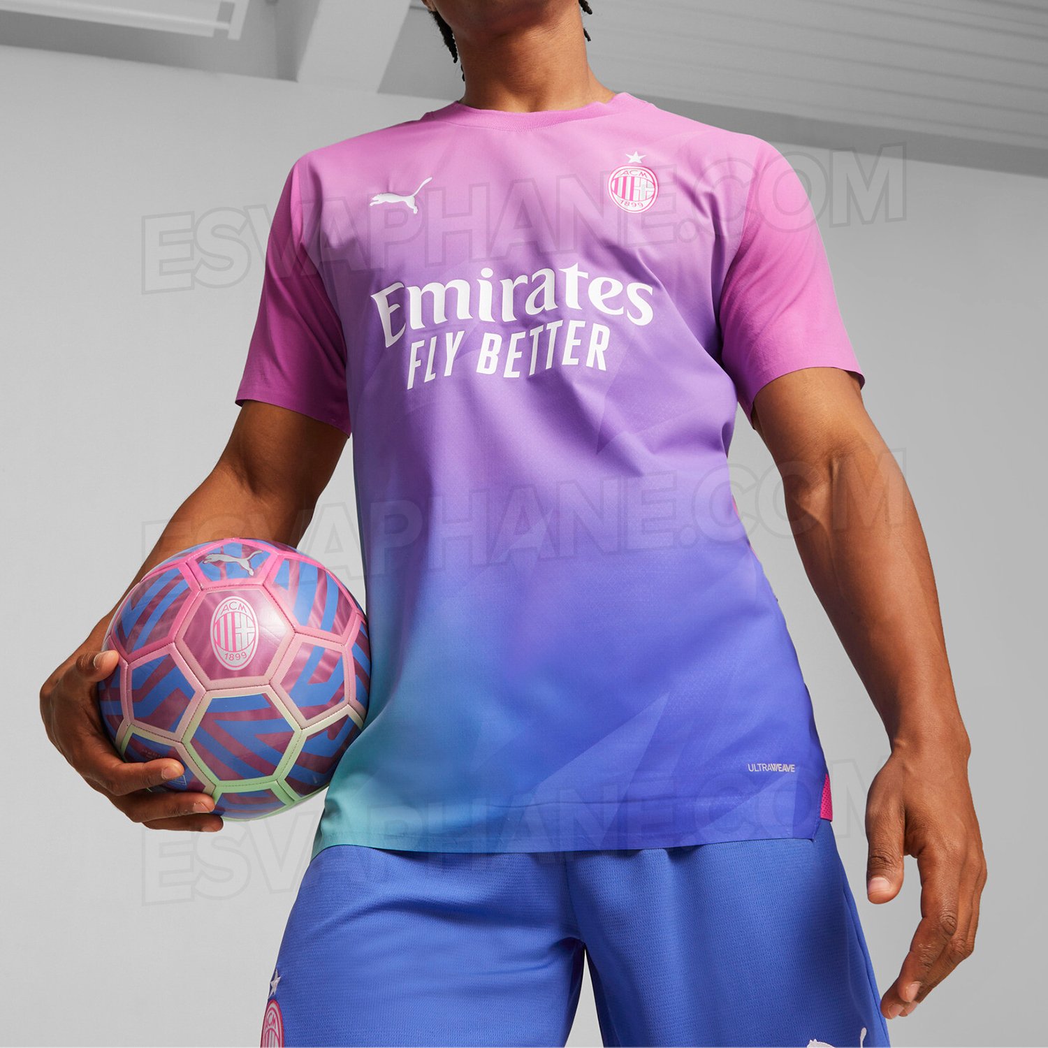 Sulla base delle immagini trapelate, si può notare come la divisa da gioco presenti una tonalità tendente al rosa nella parte più alta, sfumata verso il viola al centro e con una punta di verde e di azzurro sulla parte più bassa. Una particolarità riguarda il logo del Milan, che ha una tonalità iridescente. Tutte le caratteristiche saranno svelate il prossimo 17 agosto.