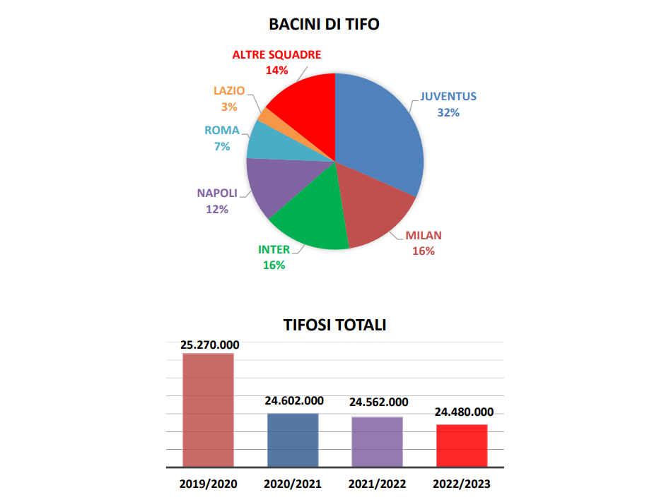 «Nell’ultima stagione si è anche assistito al controsorpasso dell’Inter sul Milan: 4.017.500 i tifosi nerazzurri, 3.943.000 quelli rossoneri, in lieve diminuzione dopo il boom scudetto. Non una novità questo avvicendamento tra seconda e terza piazza: i due club di Milano hanno praticamente lo stesso numero di tifosi e sono i risultati sportivi a determinare piccoli smottamenti. Rilevante il balzo del Napoli che supera quota 3 milioni con un incremento del 14,2% grazie all’acceleratore Scudetto. La platea delle cinque big è completata dalla Roma, stabile a 1,8 milioni», sottolinea ancora Palazzi.