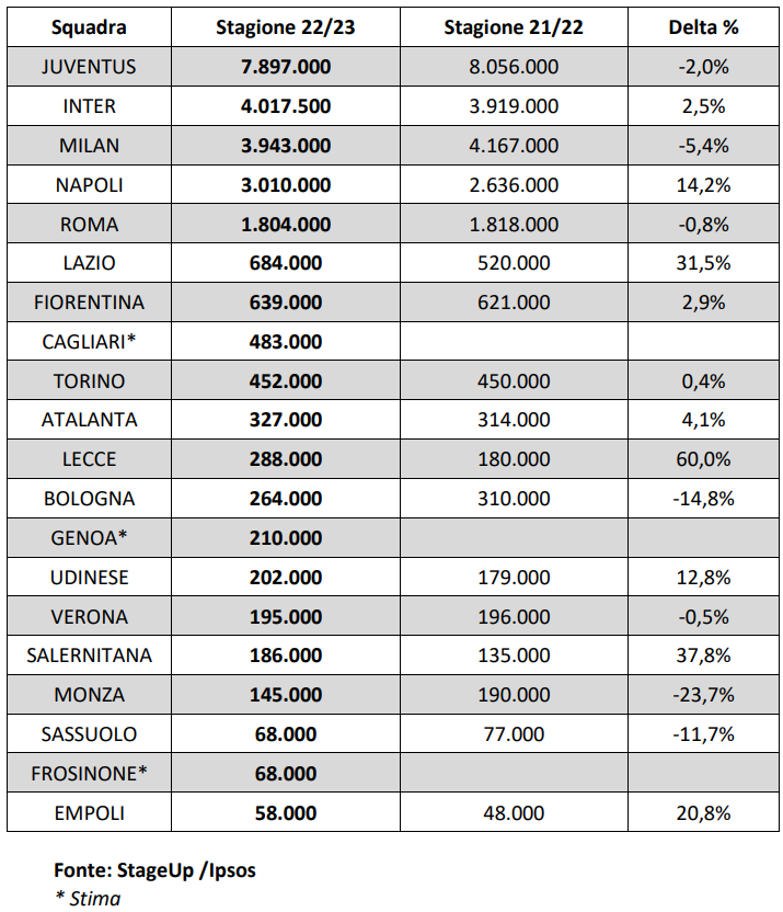 Nella tabella di seguito si trovano i dati completi relativi al bacino di tifo, squadra per squadra: nello specifico, sono riportati i dati relativi alle stagioni 2022/2023 e 2021/2022 e la relativa differenza percentuale.