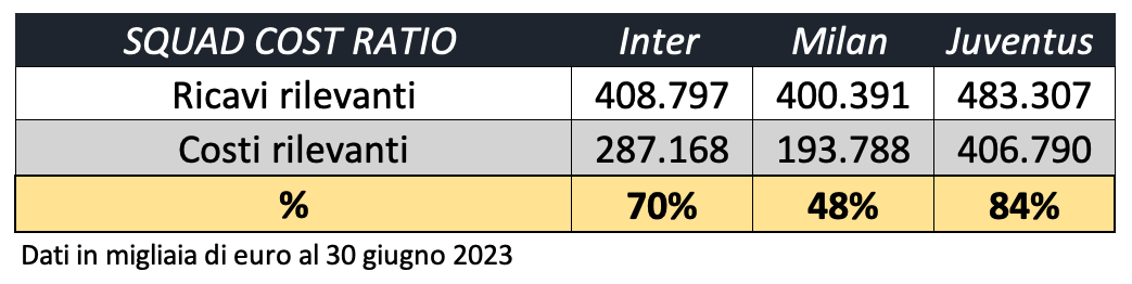 A che punto sono Inter, Juventus e Milan per quanto riguarda il rispetto del Fair Play Finanziario? Una delle novità, infatti, del nuovo “Regolamento UEFA Licenze per Club e Sostenibilità Finanziaria” introdotto è la regola denominata “squad cost ratio”, ovverosia il rapporto tra i ricavi e i costi legati alla squadra, con un tetto fissato al 70% da raggiungere entro tre anni (si parte dal 90% dalla stagione 2023/24 per arrivare al 70% nel 2025/26). Si tratta, come detto, di uno dei tre indicatori che la UEFA controllerà a livello economico per quanto riguarda i club: gli altri sono quelli denominati “football earnings” (chs sostituisce il concetto di break-even) e dei debiti scaduti.