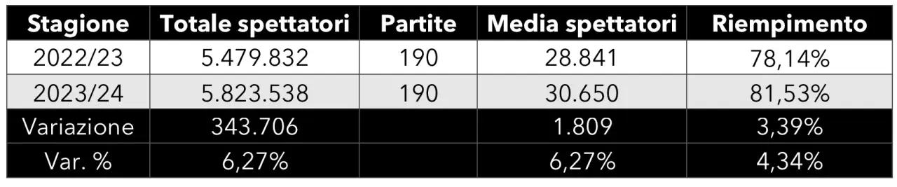 Al giro di boa del campionato nel 2022/23, la media spettatori era pari a 28.841, con uno scarto di 1.809 persone a incontro rispetto ai 30.650 del girone di andata nel 2023/24. Si tratta di una crescita di oltre il 6%, con il dato complessivo sull’affluenza negli impianti che passa da poco meno di 5,5 milioni a oltre 5,8 milioni di spettatori.