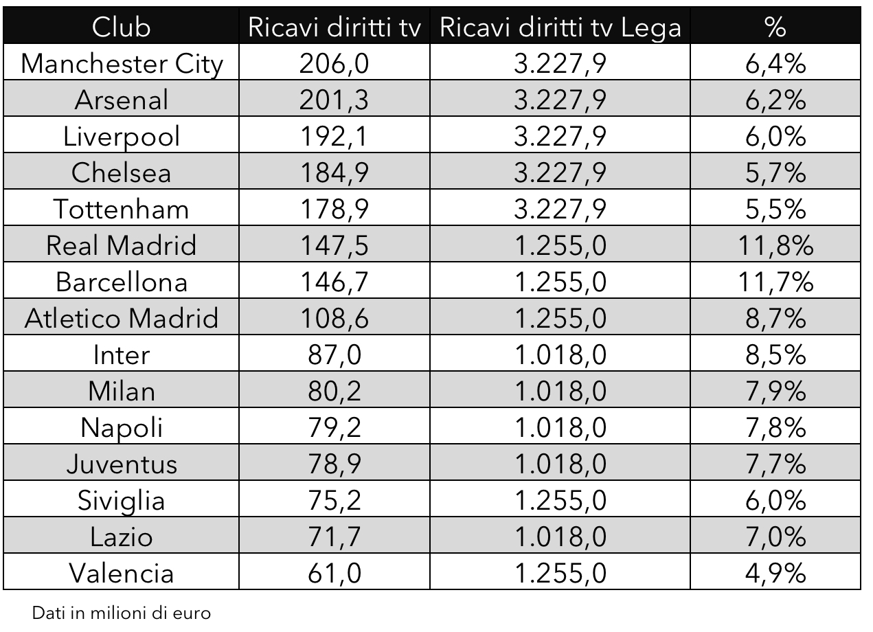 Considerando le cinque squadre analizzate per campionato, i club italiani hanno incassato il 39% del totale (397 milioni su 1,018 miliardi), contro il 42,9% dei club spagnoli (539 milioni su 1,25 miliardi) con Barcellona e Real Madrid che da sole valgono il 23%, mentre i club inglesi nonostante ricavi quasi doppi rispetto alla rivale più vicina hanno un impatto pari al 29,8% (963 milioni su 3,22 miliardi).