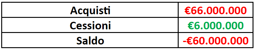 Considerando invece il solo saldo tra entrate e uscite per quanto riguarda i cartellini (solo le operazioni a titolo definitivo), la sessione di mercato per il Milan finora vede un saldo negativo di circa 60 milioni di euro.