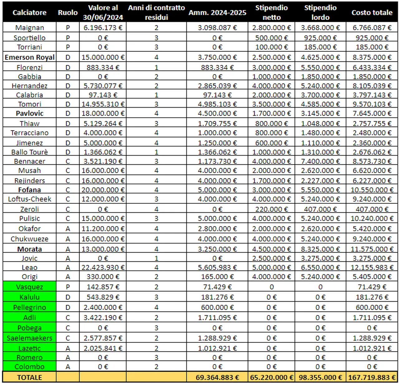 A livello di stipendi – elaborati utilizzando i dati che emergono dalle indiscrezioni della stampa sportiva e stimando gli ingaggi dei calciatori più giovani, per cui non sono disponibili dati –, Rafael Leao guida il gruppo con i suoi 5 milioni di euro netti, anche se Morata costa di più al club, non potendo usufruire degli sgravi previsti dal Decreto Crescita.