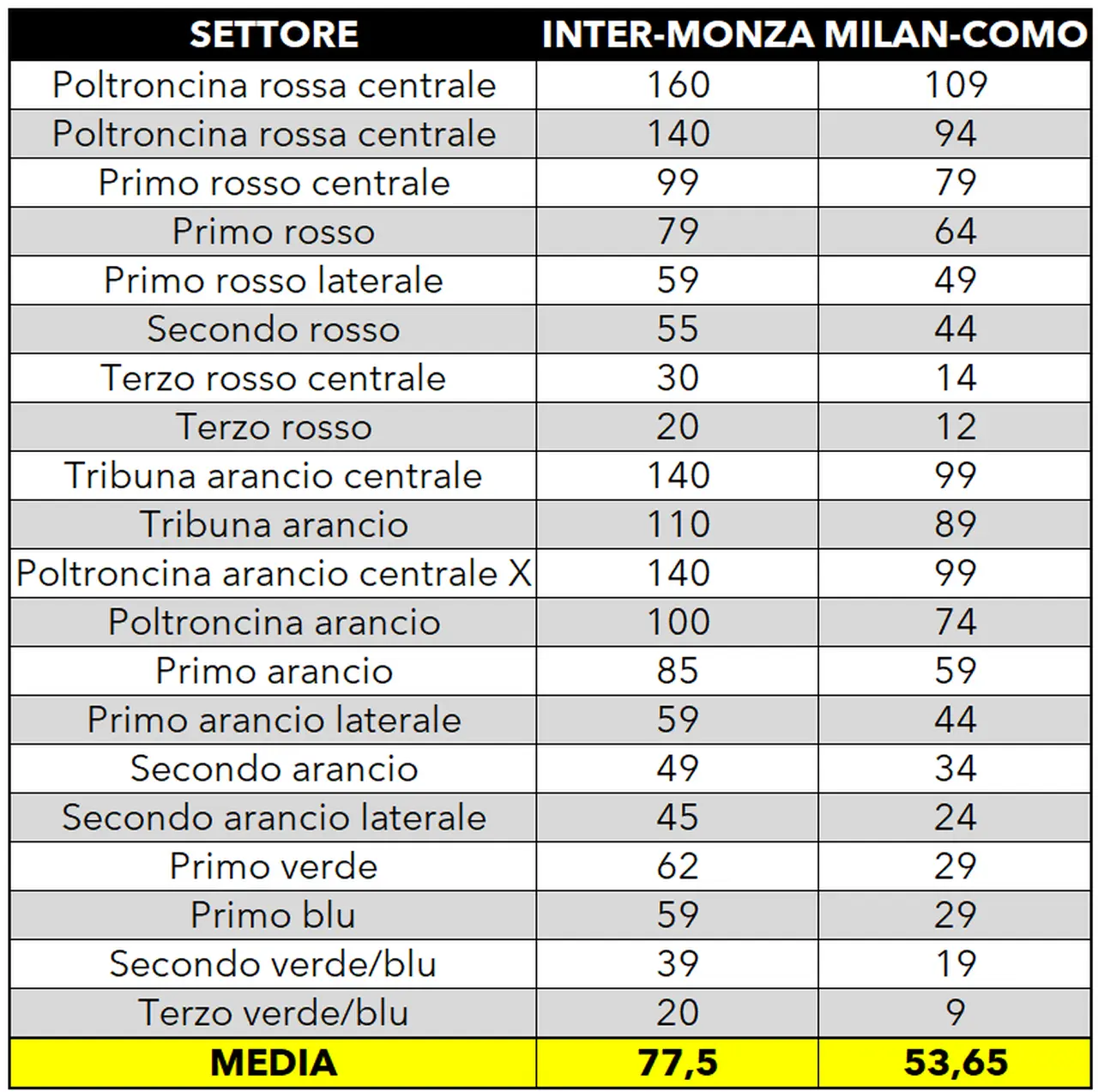 Discorso simile anche per i biglietti più cari, con la poltroncina rossa centrale in vendita a 160 euro per Inter-Monza e a 109 euro per Milan-Como. Meno accentuata, invece, la differenza in alcuni settori tra primo e secondo anello, con alcuni prezzi che sono addirittura identici (il secondo arancio a 49 euro, per fare un esempio).Insomma, se il Milan sta cercando di proporre un listino più oculato per portare i propri tifosi allo stadio anche in un’annata complicata (la sfida con il Como è infatti andata sold out), l’Inter, da parte sua, sta spingendo sui prezzi forte sicuramente di un entusiasmo importante per i traguardi che la squadra di Inzaghi può ancora raggiungere. Considerando i settori venduti allo stesso modo dai due club, per le due partite la media prezzo in vendita libera varia dai 77,5 euro a biglietto dell’Inter ai poco più di 53,6 euro per il Milan.