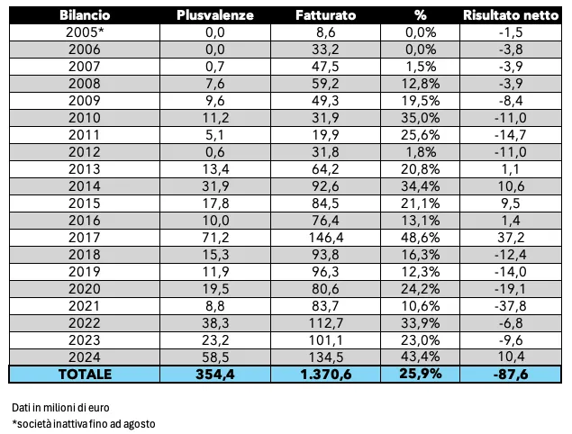 Proprio le plusvalenze sono sempre state un fattore determinante negli ultimi anni per il bilancio del Torino di Urbano Cairo. Il 2024 ha registrato un totale di 58,5 milioni su un fatturato complessivo di 134,5 milioni, pari al 43,4% del totale. Si tratta della secondo anno relativi a questi dati dietro al 2017, quando le plusvalenze registrate furono pari a 71,2 milioni che portarono il fatturato a un risultato record di 146,4 milioni, per una incidenza del 48,6%.