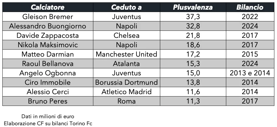 Quella del difensore cresciuto nel settore giovanile granata è la seconda più alta mai registrata dal Torino dopo quella di Gleison Bremer, ceduto alla Juventus nell’estate 2022 per una plusvalenza pari a 37,3 milioni. Per quanto riguarda Bellanova, l’esterno ora all’Atalanta rappresenta per i granata la sesta plusvalenza più alta. Di seguito le cessioni che hanno portato più benefici al bilancio del Torino nelle stagioni sotto la gestione Cairo, che ha acquistato il club nel 2005: