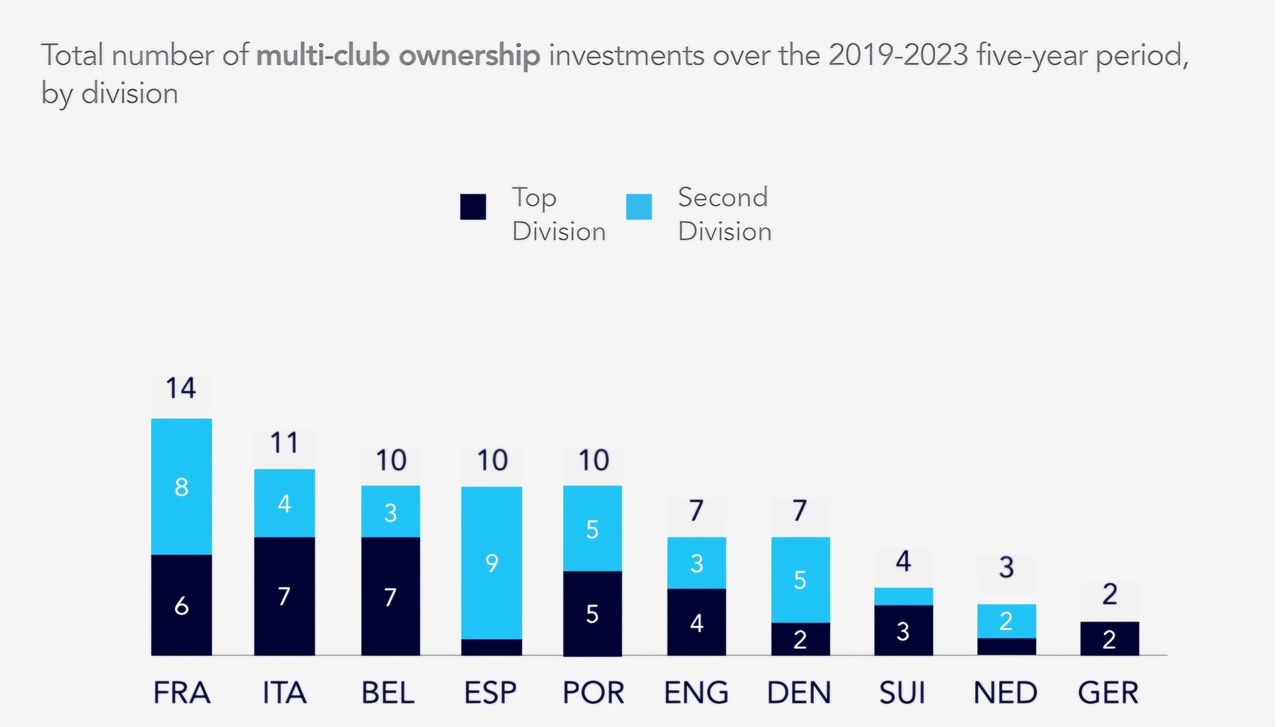 In base all’analisi svolta da Play the Game a maggio 2024, le stime indicavano che 134 gruppi di multiproprietà detenessero la maggioranza o una percentuale rilevante di partecipazioni in ben 366 club a livello globale, per un totale di oltre 13.000 giocatori coinvolti. Nel 2012, i club appartenenti a gruppi che possiedono quote in due o più club erano solo 40. I seguenti grafici pubblicati nel report CIES 2024 sulle multiproprietà nel periodo 2019-2023, mostrano visivamente tale incremento: