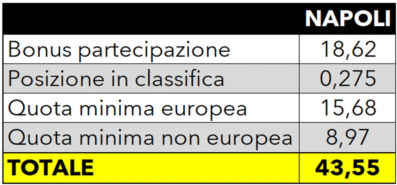 Partendo da questi presupposti, e considerando le squadre che ad ora si potrebbero qualificare per la prossima edizione della UEFA Champions League, il Napoli incasserebbe 15,7 milioni di euro circa di quota europea e poco meno di 9 milioni di euro di quota non europea.