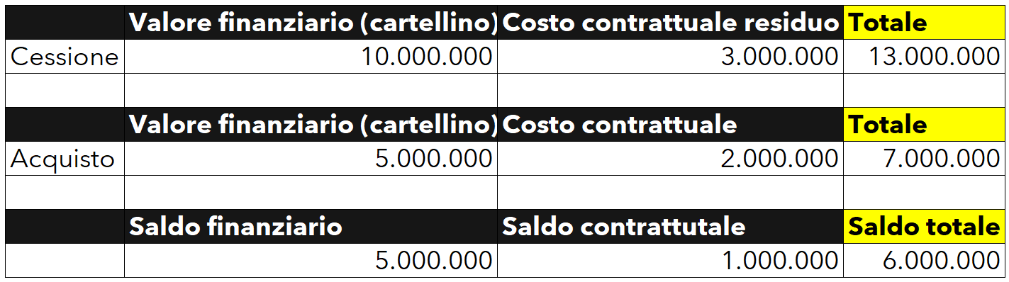 Per capire come si arrivi ad un saldo positivo, ipotizziamo ad esempio una operazione: una squadra vende un giocatore per 10 milioni di euro, con costo contrattuale residuo di 3 milioni di euro, e acquista un giocatore per 5 milioni di euro con costo contrattuale complessivo di 2 milioni. In questo caso, quindi, il saldo totale dell’operazione è positivo per 6 milioni di euro.