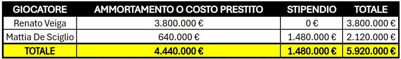 Grazie a queste uscite, la Juventus libererà in totale circa 5,9 milioni di euro a bilancio. Si tratta dei 3,8 milioni sostenuti per il prestito di Veiga dal Chelsea (cifra che comprendeva anche il pagamento dello stipendio) e dei 2,1 milioni circa di Mattia De Sciglio, tra quota ammortamento e la parte di stipendio a cui la Juve ha partecipato nonostante il prestito all’Empoli.