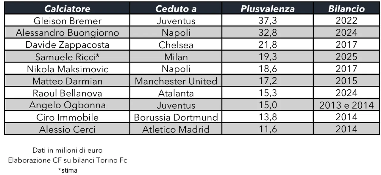 Negli anni il fatturato del Torino, compreso quello del 2024, è stato spinto dalle plusvalenze, cresciute negli ultimi anni e con un picco nel 2017. In particolare le cessioni che hanno avuto un impatto maggiori sui conti del Torino sono quelle di Gleison Bremer alla Juventus (la maggiore, 37,3 milioni) e di Alessandro Buongiorno al Napoli (32,8 milioni di euro).
