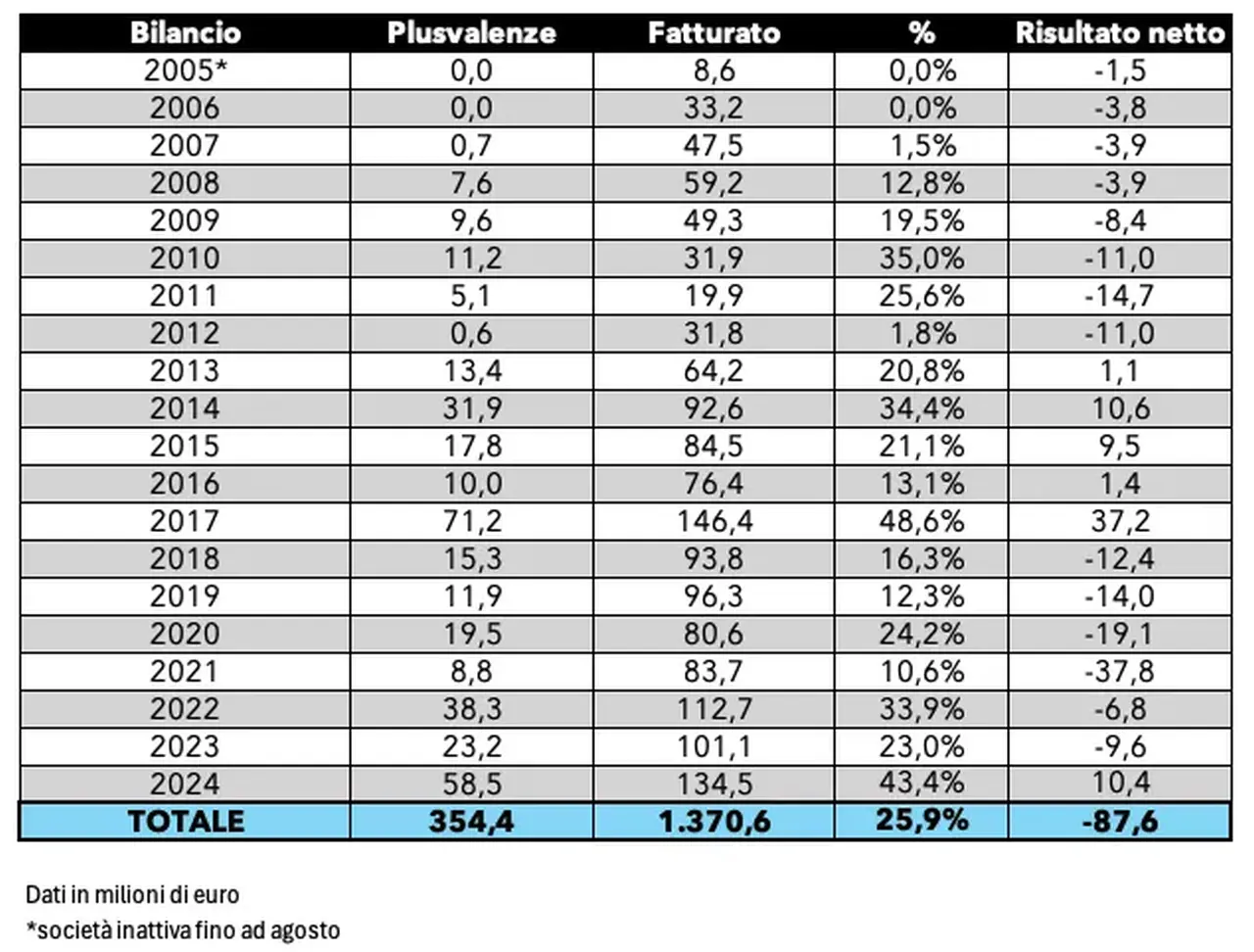 Proprio le plusvalenze sono sempre state un fattore determinante negli ultimi anni per il bilancio del Torino di Urbano Cairo. Il 2024 ha registrato un totale di 58,5 milioni su un fatturato complessivo di 134,5 milioni, pari al 43,4% del totale. Si tratta della secondo anno relativi a questi dati dietro al 2017, quando le plusvalenze registrate furono pari a 71,2 milioni che portarono il fatturato a un risultato record di 146,4 milioni, per una incidenza del 48,6%.