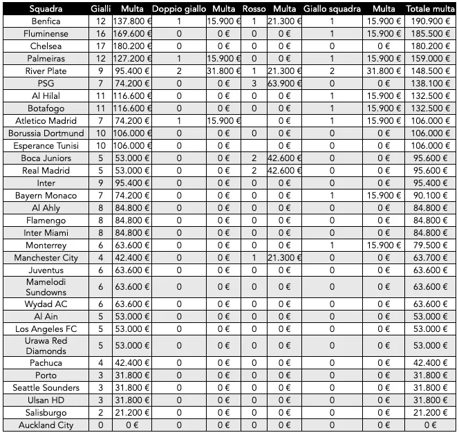 Mondiale per Club classifica multe – Il costo delle sanzioni