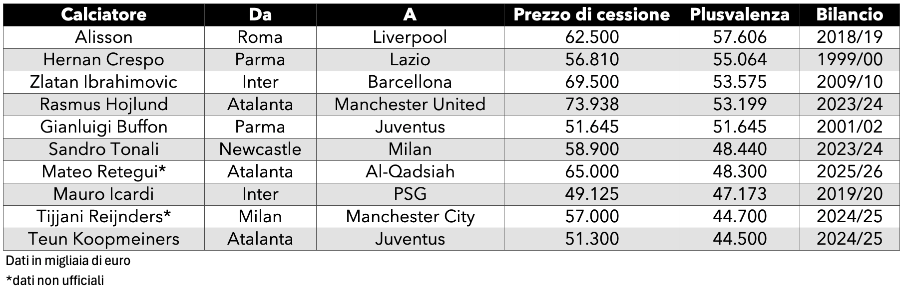 Andando invece oltre le prime 10 posizioni, troviamo operazioni più datate, fatta eccezione per un paio di affari che si sono conclusi tra giugno e luglio del 2025: la cessione di Mateo Retegui dall’Atalanta ai sauditi dell’Al-Qadsiah e quella di Tijjani Reijnders al Manchester City, penultima nella top 20 e davanti solamente a quella che la stessa Atalanta realizzò per la vendita di Koopmeiners alla Juventus nel 2024.