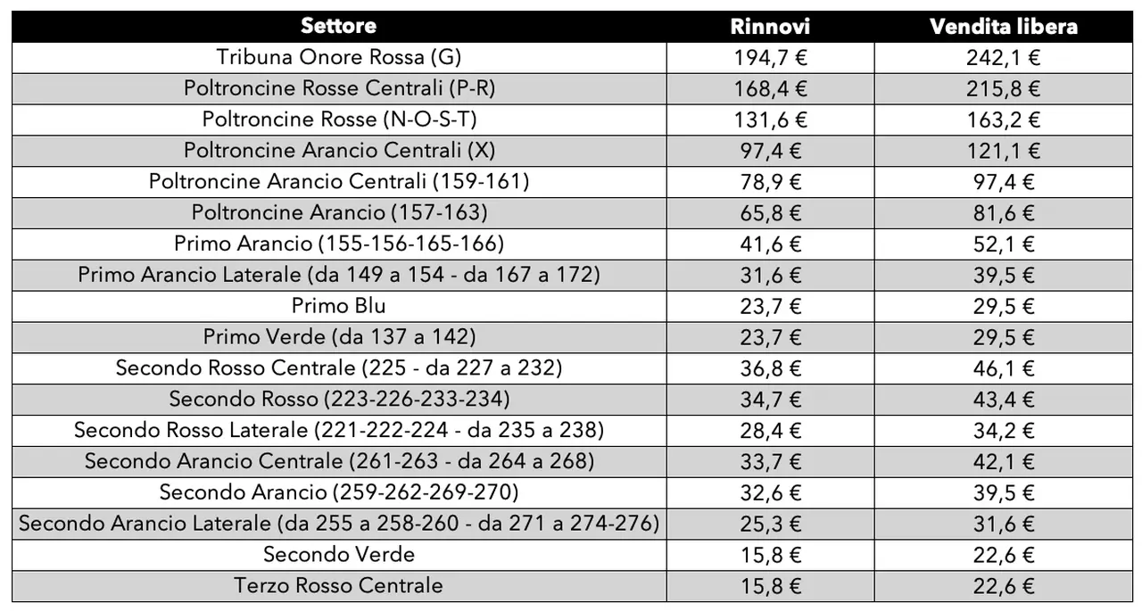 Sulla base di queste indicazioni, gli abbonati riceverebbero una quota variabile tra un massimo di 195 e un minimo di 16 euro (per quanto riguarda gli abbonamenti sottoscritti in fase di rinnovo), o tra i 242 e i 22 euro per quanto riguarda invece le tessere sottoscritte in fase di vendita libera. La quota è relativa al rateo dell’abbonamento, considerando le 19 partite casalinghe del campionato.