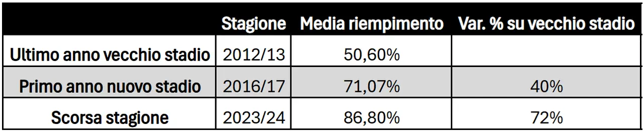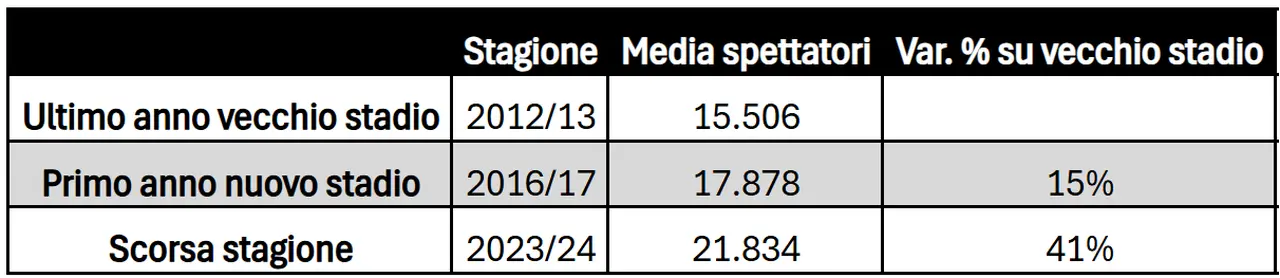 L’andamento è monotono crescente anche per quanto concerne il dato sugli spettatori visto che la media spettatori è passata dai 15mila dell’ultima stagione nel vecchio stadio agli oltre 21mila del 2023/24.