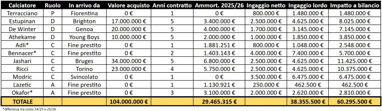 A questa cifra ci si arriva sommando le plus/minusvalenze realizzate, l’incasso dai prestiti (quando è presente), il risparmio di ammortamento (nel caso dei giocatori ceduti a titolo definitivo) e il risparmio sull’ingaggio lordo per i giocatori usciti dalla rosa rossonera rispetto alla stagione 2024/25.