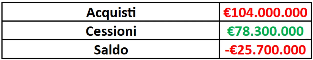 Considerando invece il solo saldo tra entrate e uscite per quanto riguarda i cartellini (solo le operazioni a titolo definitivo), la sessione di mercato per il Milan finora vede un saldo negativo di circa 25,7 milioni di euro.