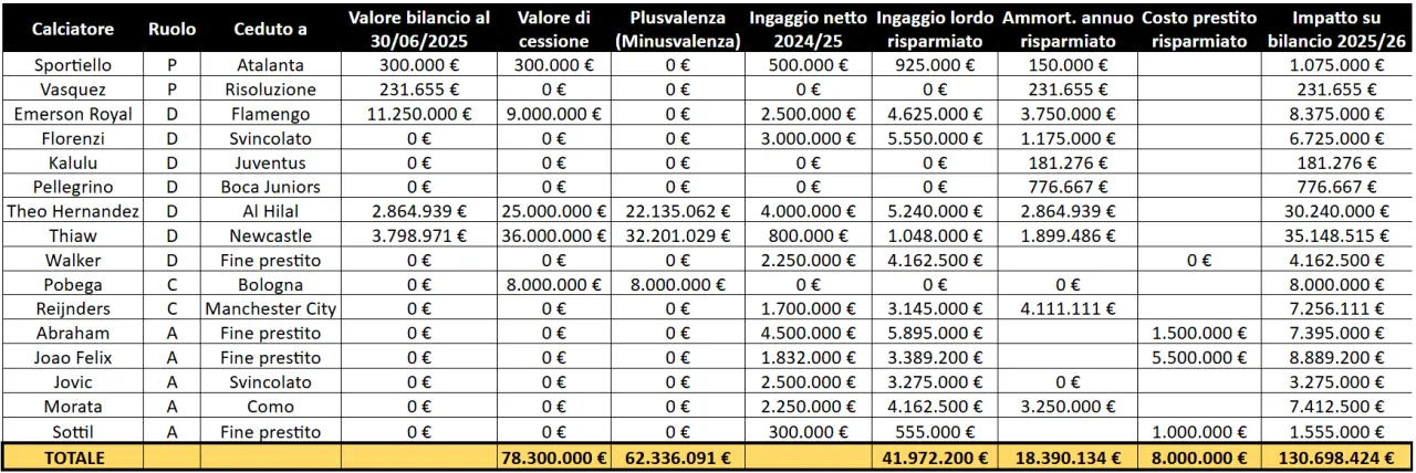 Tra le operazioni in uscita, il Milan finora ha realizzato in particolare le cessioni di Sportiello, Emerson Royal, Theo Hernandez, Thiaw e Pobega con incassi per complessivi 78,3 milioni e plusvalenze per 62 milioni circa. Le plusvalenze derivanti da altre cessioni importanti – come quelle di Kalulu e Reijnders – impattano sul bilancio chiuso al 30 giugno 2025, di conseguenza si conta solo il risparmio di ammortamento e stipendio nel 2025/26.