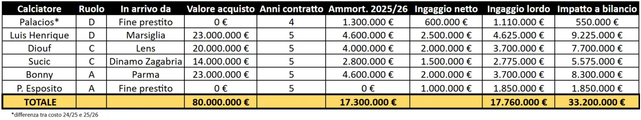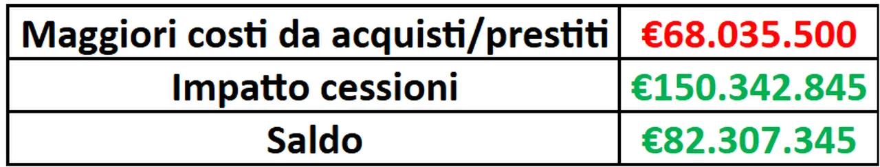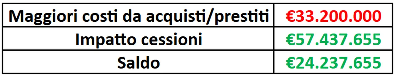 Invece le operazioni in uscita, e il prestito di Valentin Carboni, dovrebbero avere un impatto positivo per circa 57,4 milioni sul bilancio 25/26.