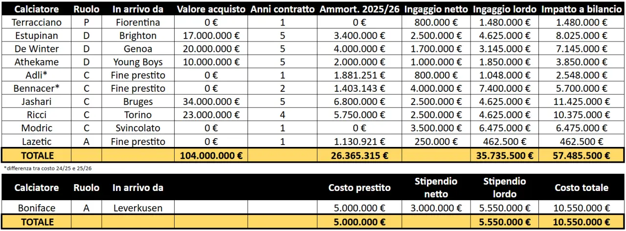 Il Milan ha comprato sinora il portiere Pietro Terracciano, i difensori Esupinan, De Winter e Athekame e i centrocampisti Jashari e Ricci. Inoltre, sarà ufficiale a breve l’acquisto (seppur in prestito) dell’attaccante Victor Boniface, anche se per quest’ultimo manca l’ufficialità visto che bisognerà aspettare il via libera definitivo dopo la conclusione dei test fisici previsti dal Milan stesso dopo le visite mediche di rito. È poi arrivato a parametro zero Modric. In particolare le operazioni in entrata, tra ammortamenti dei calciatori acquistati a titolo definitivo e stipendi lordi, dovrebbero tradursi sinora in maggiori costi per circa 68 milioni.