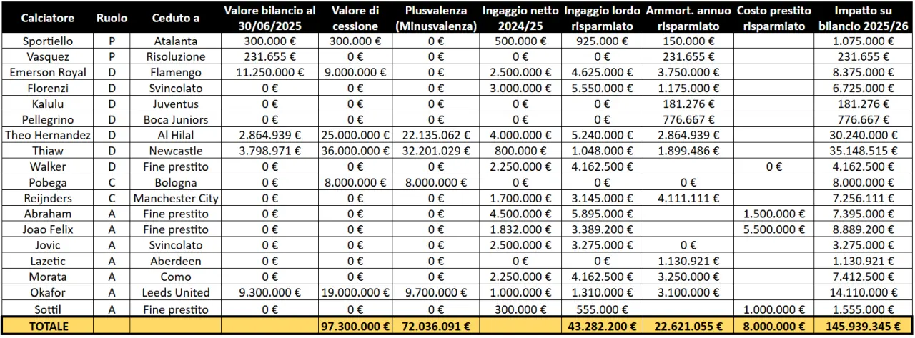 Tra le operazioni in uscita vanno segnalate le cessioni di Sportiello, Emerson Royal, Theo Hernandez, Thiaw, Okafor e Pobega con incassi per complessivi 97,3 milioni e plusvalenze per 72 milioni circa. Le plusvalenze derivanti da altre cessioni importanti – quali Kalulu e Reijnders – impattano sul bilancio chiuso al 30 giugno 2025, quindi si conta solo il risparmio di ammortamento e stipendio nel 2025/26. Tra i giocatori in uscita sono considerati anche la conclusione dei contratti di Vasquez (risoluzione), Florenzi e Jovic. A questi si aggiunge la conclusione di tutti i prestiti della stagione passata, (Filippo Terracciano, Bondo e Zeroli, Sottil, Walker, Abraham e Joao Felix) che pesavano per complessivi 25 milioni. Queste operazioni in uscita dovrebbero avere un impatto positivo per circa 150 milioni di euro sul bilancio.