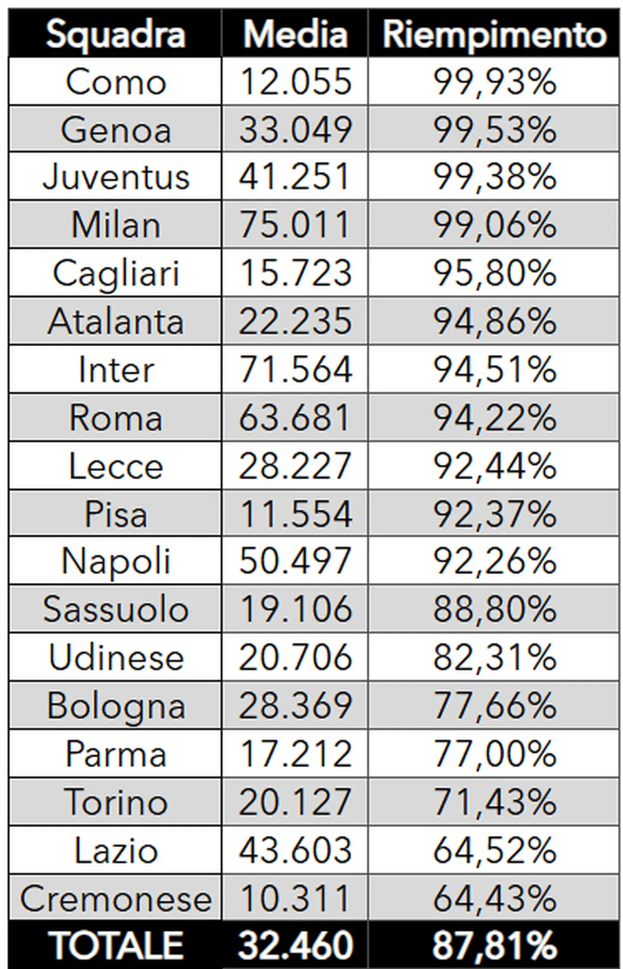 Dopo la seconda giornata, 11 società su 18 (Fiorentina e Verona non hanno ancora giocato in casa) hanno superato il 90% con vette altissime per Como, Genoa, Juventus e Milan, tutte oltre il 99%. La media di riempimento si avvicina all’88%, ma per avere un dato più lineare bisognerà comunque attendere qualche giornata e che tutte le squadre abbiano giocato in casa almeno una partita.