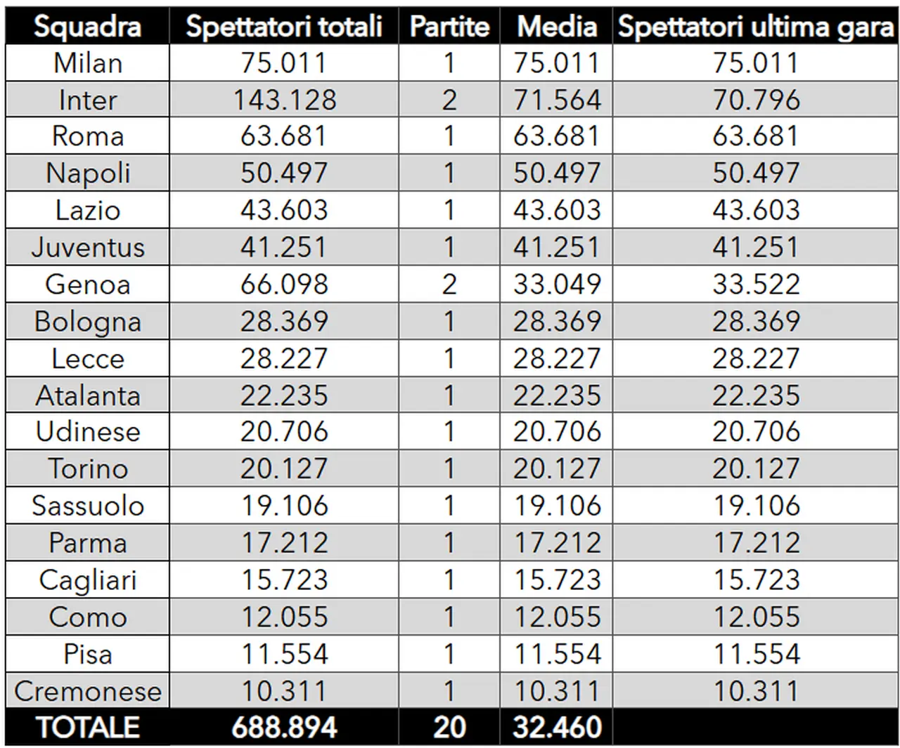 Serie A spettatori 2025 2026 – Il Milan inizia in vetta